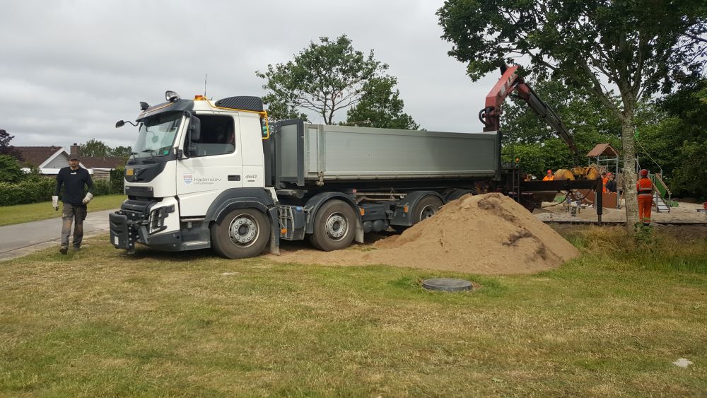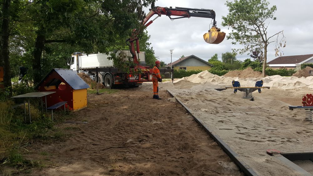 Arbejdets omfang er udgravning af området, opsætning og montering af alle legeredskaber, opfyldning med faldsand samt levering af borde-bænkesæt.