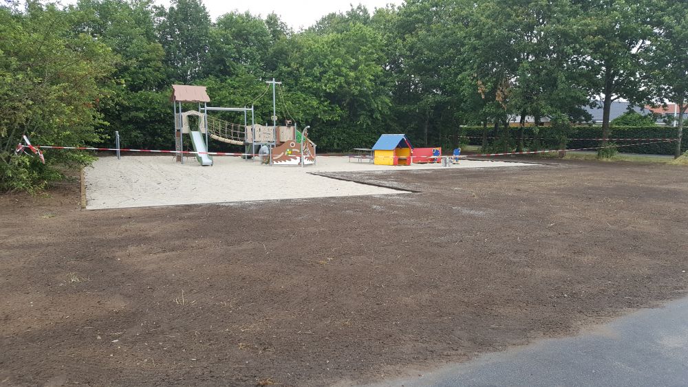 Det røde bånd om legepladsen er fjernet, og rykket ud til lampestanderne, for at beskytte arealet med nysået græs.