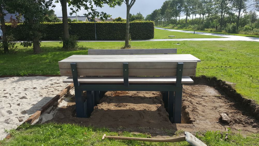 Montering af 2 borde-bænkesæt på Runebandens Legeplads, er ved at være helt på plads.