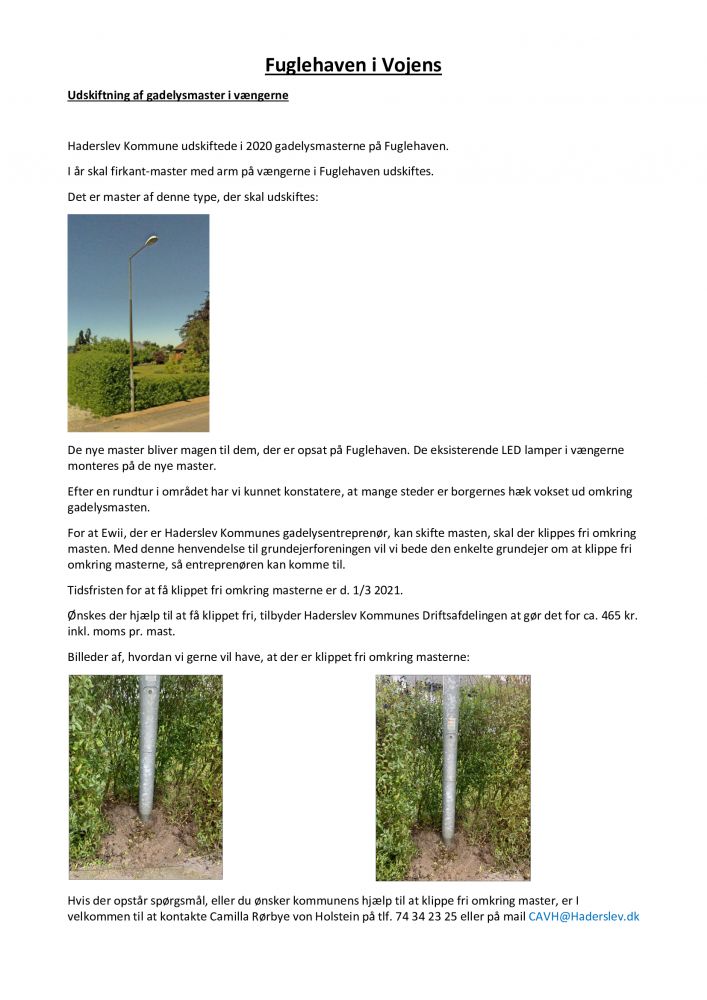 Kommunens gadelysentreprenør har kørt en runde i vængerne omkring Fuglehaven, og har kunnet konstatere, at der fortsat er borgere, der ikke har fået klippet fri omkring gadelysmasterne.